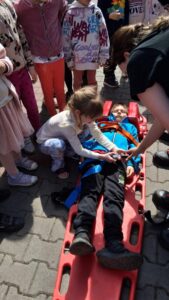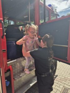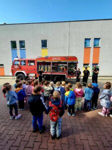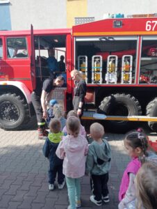 Dzieci dowiedziały się, jak wygląda praca strażaka, w jakich sytuacjach wzywamy pomoc oraz jak zachować się w przypadku niebezpieczeństwa. Szczególną uwagę poświęcono omówieniu numerów alarmowych, dzięki czemu przedszkolaki utrwaliły wiedzę, jak wezwać odpowiednie służby ratunkowe. Dzieci mogły z bliska zobaczyć specjalistyczny sprzęt i strój, a nawet go przymierzyć! Wielką atrakcją była możliwość wejścia do wozu strażackiego oraz wysłuchanie sygnału syreny!