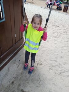 i Atrakcji w Wilkowicach. Dzieci spędziły aktywny dzień na świeżym powietrzu, korzystając z różnorodnych atrakcji parku. Najwięcej emocji wzbudził ogromny drewniany krokodyl – dzieci wspinały się na jego grzbiet po drewnianych łapach, pokonując ścianki wspinaczkowe, a potem zjeżdżały z ogona po rolkach, przeżywając prawdziwą przygodę! Nie zabrakło też szaleństw na trampolinach i placach zabaw, które zapewniły mnóstwo ruchu i śmiechu. W czasie spaceru po mini zoo dzieci z zainteresowaniem obserwowały różne zwierzęta – od kóz i królików po osiołki i egzotyczne ptaki. Prawdziwą gwiazdą wycieczki okazała się jednak kolorowa papuga, która witała wszystkich głośnym „Ahoj!” i wdzięcznie stroszyła piórka, zachwycając małych gości. To był dzień pełen wrażeń, ruchu i radości, który na długo zostanie w naszej pamięci!