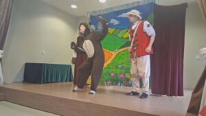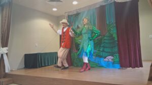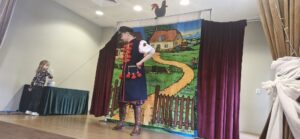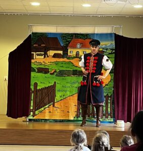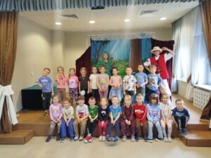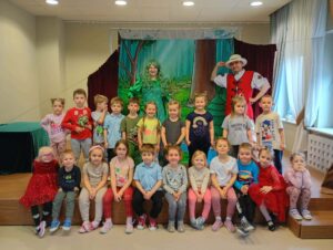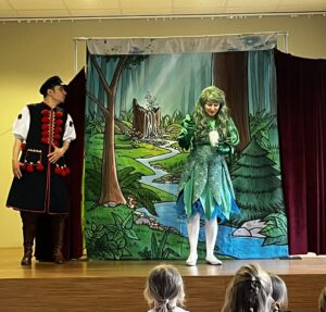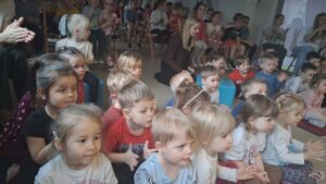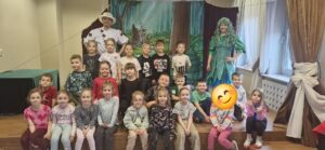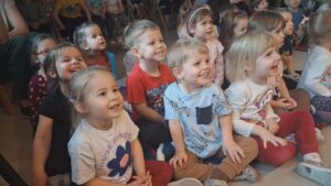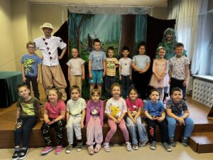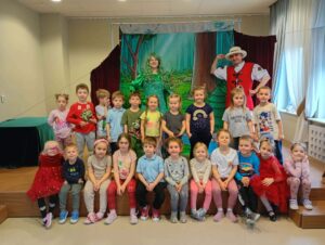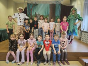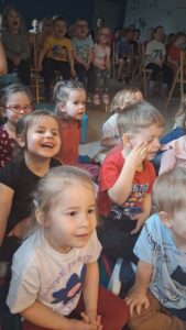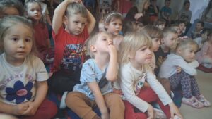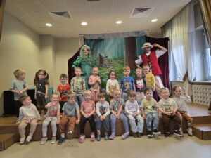 z teatrem. Odwiedził nas zaprzyjaźniony Teatr Bajkowe Skarbki Śląska, który zaprezentował spektakl pt. „O zaczarowanym źródle”. Podczas przedstawienia mali widzowie z ogromnym zainteresowaniem śledzili losy bohaterów, jednocześnie odkrywając różnorodne role odgrywane przez artystów. Barwna i pełna zaangażowania gra aktorska sprawiła, że dzieci z zapartym tchem przeżywały kolejne przygody i żywo reagowały na to, co działo się na scenie.