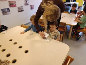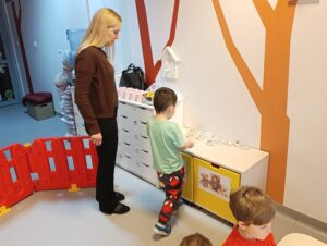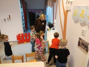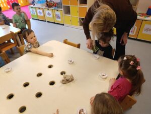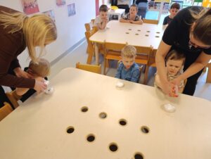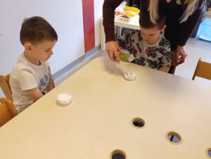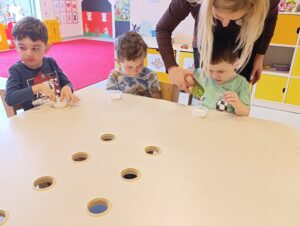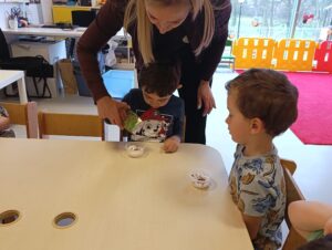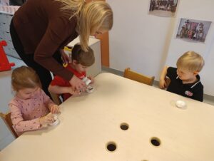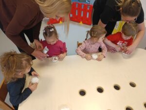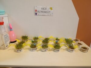 Przed świętami wielkanocnymi dzieci z grupy Czerwonych Krasnoludków posiały rzeżuchę. Systematycznie ją podlewały, troskliwie pielęgnowały i z zainteresowaniem obserwowały jak rośnie. Następnie ozdobiły pojemniczki, nadając im wygląd wesołych kurczaczków, i zabrały swoje prace do domu.