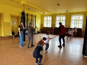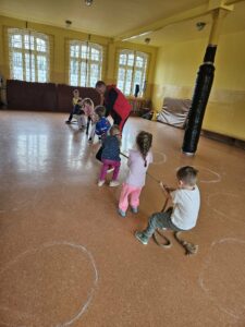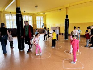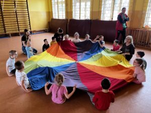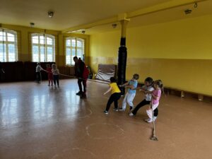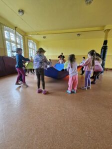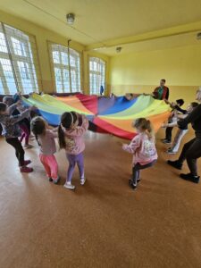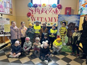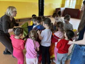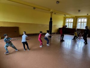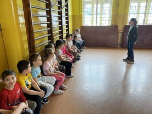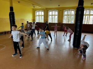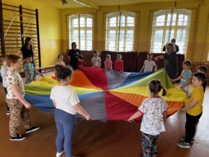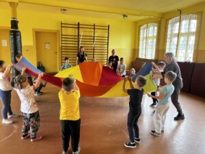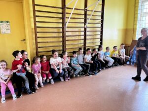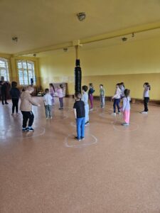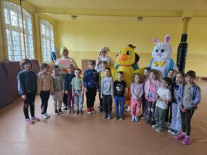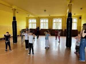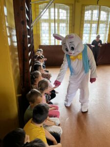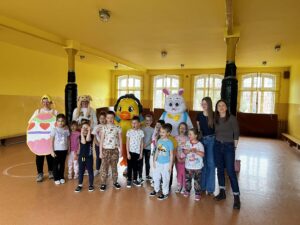 Dzieci zwiedziły budynek szkolny oraz dowiedziały się, jak wygląda codzienny dzień ucznia. Największą radość sprawił im udział w zajęciach sportowych na sali gimnastycznej, podczas których mogły aktywnie spędzić czas i poczuć się jak prawdziwi uczniowie. Na dzieci czekała również miła niespodzianka wielkanocna – spotkały zająca, baranka, kurczaczka oraz pisankę, od których otrzymały słodki upominek. Wizyta była bardzo ciekawym i radosnym doświadczeniem. Dziękujemy za miłe przyjęcie!